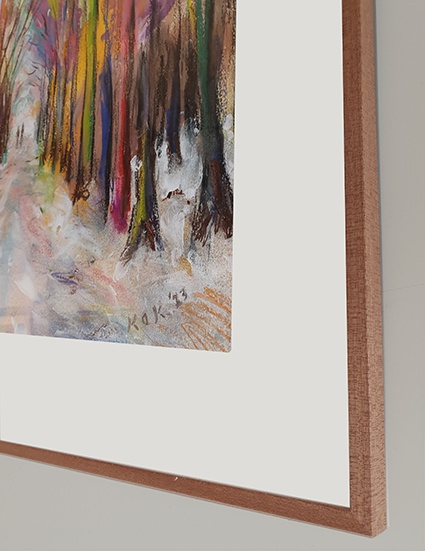 Het schilderij is ingelijst in een houten lijst, kleur donkerbruin met passepartout. Afmeting 85 x 60 cm.
