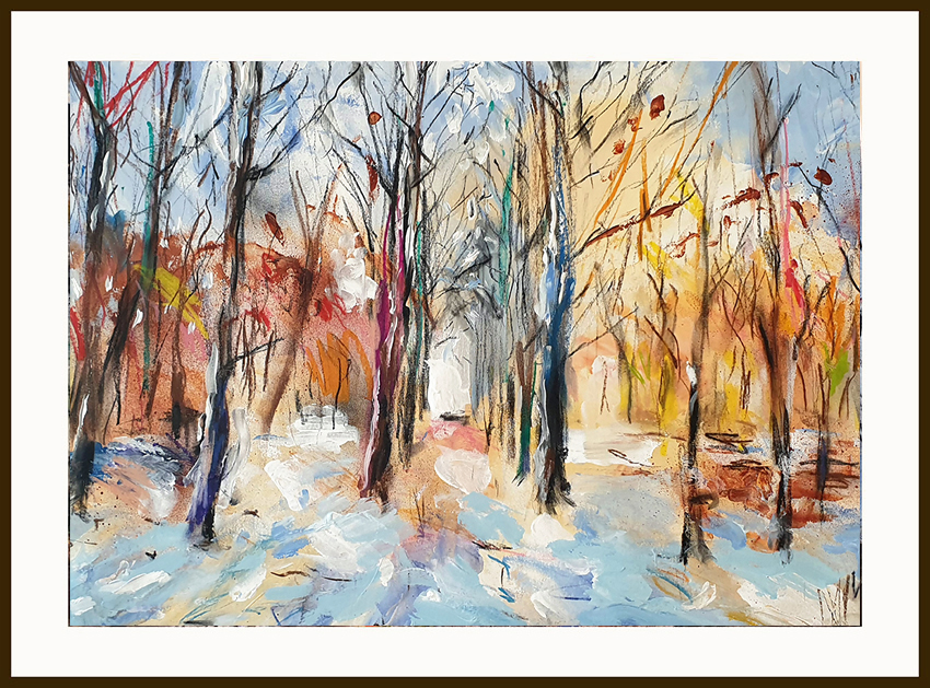 The painting is framed in a wooden frame, color dark brown with passe-partout. Size 85 x 60 cm.
