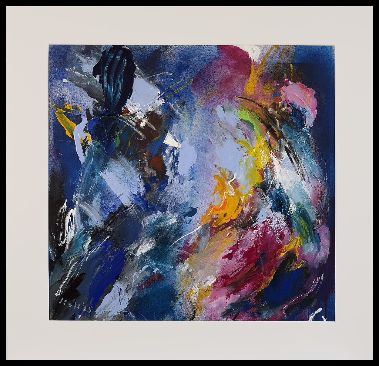 The painting is framed in an aluminium frame, color black with high quality passe-partout.