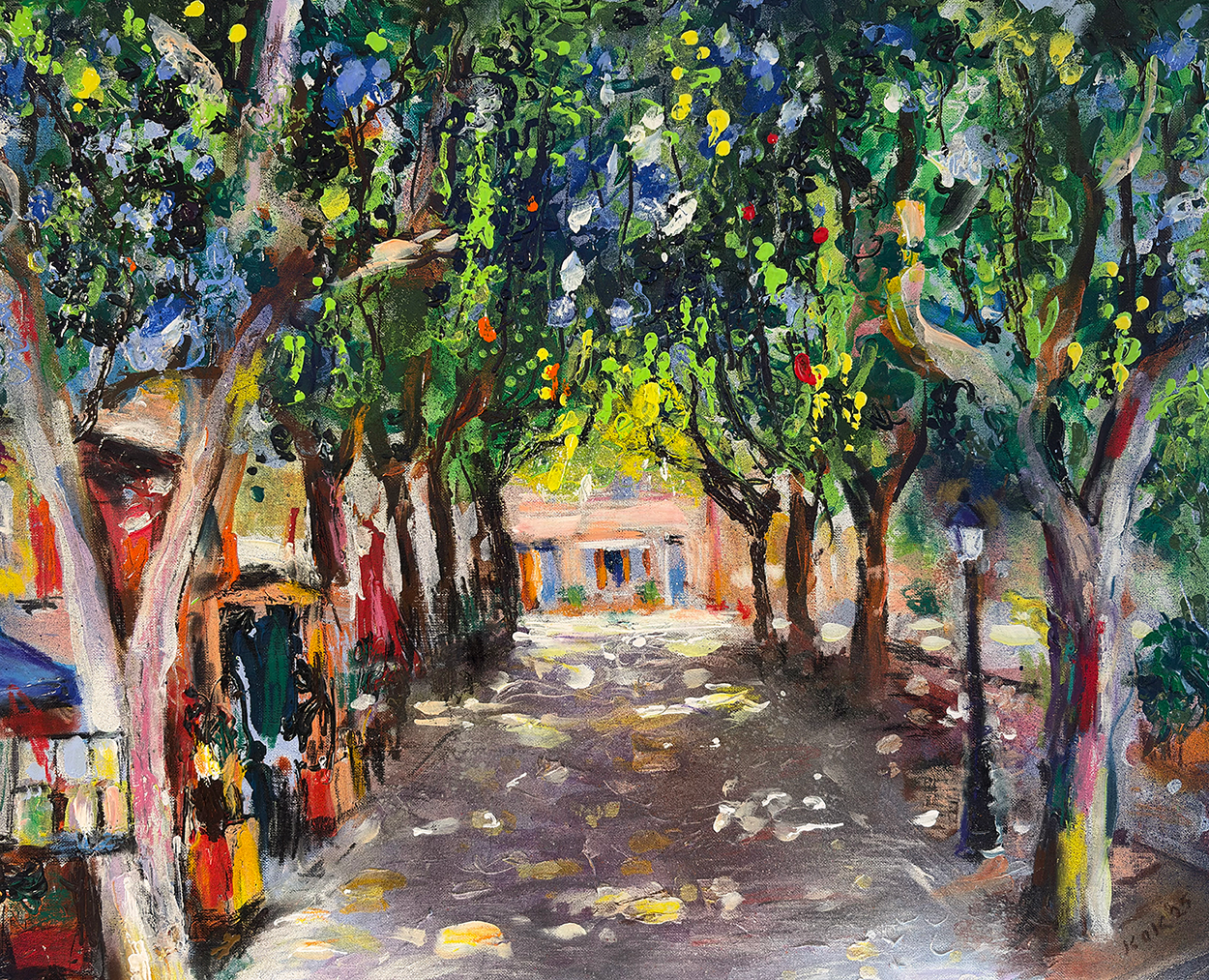 Uniek schilderij van het plein van het dorpje ‘Villecroze’ in Zuid-Frankrijk.